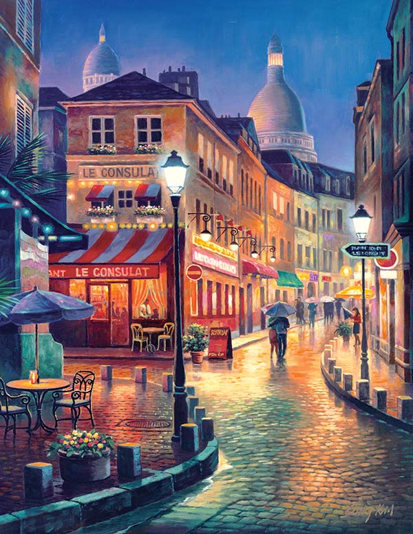 Night Stroll by Sung Kim. This beautiful painting is set in the Montmartre district of Paris, France. Giclee print available in both high quality canvas and paper. If you see this image being sold elsewhere, it is copyright infringement!